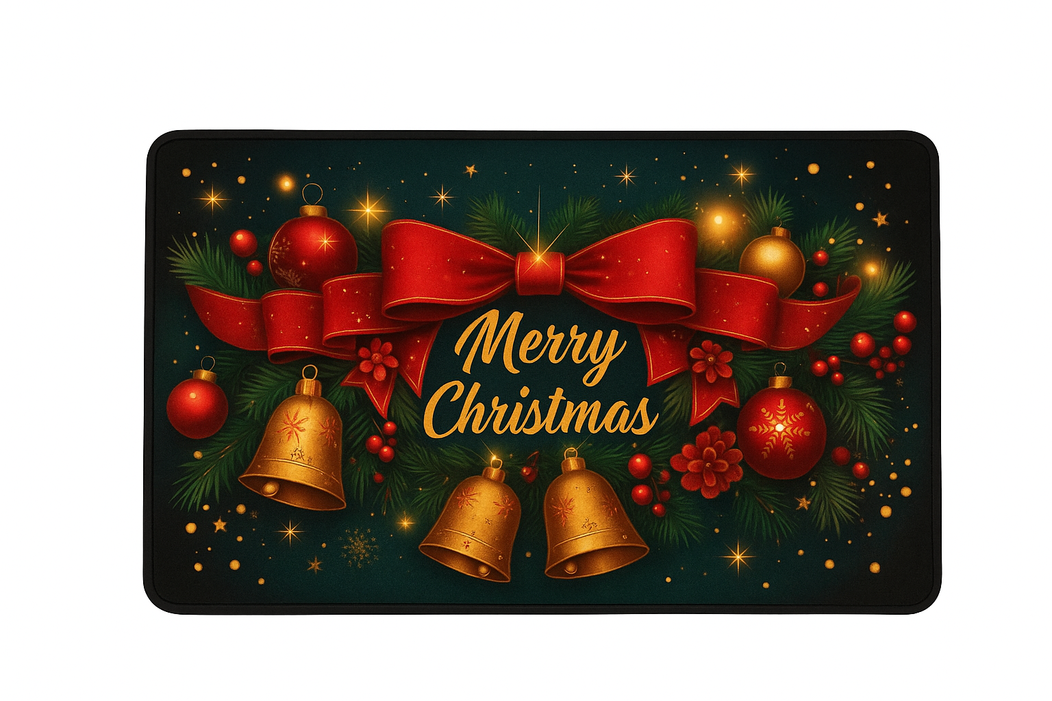 Decorate your home with this vibrant Christmas mat featuring the words “Merry Christmas,” gold bells, and red bows. Soft, durable, and non-slip, it’s perfect for both indoor and outdoor use. Made of thick polyester, it’s easy to clean and machine washable. Perfect for your front door, living room, bathroom, or as a Christmas gift.