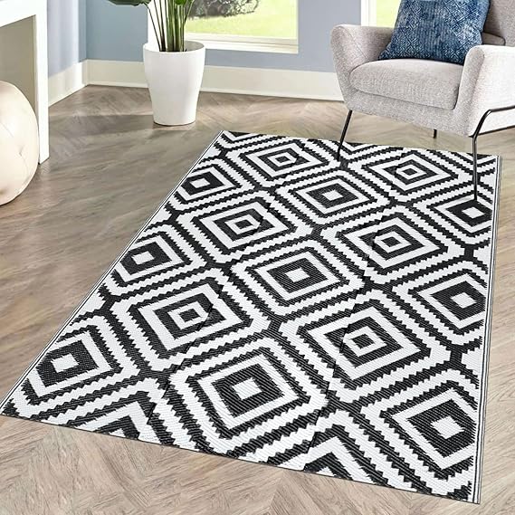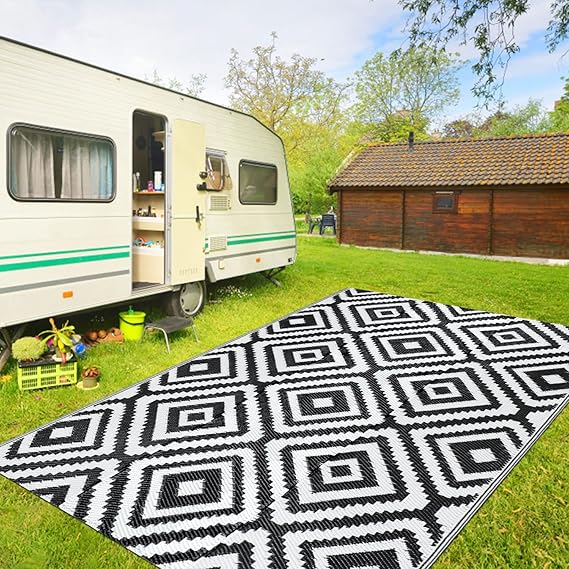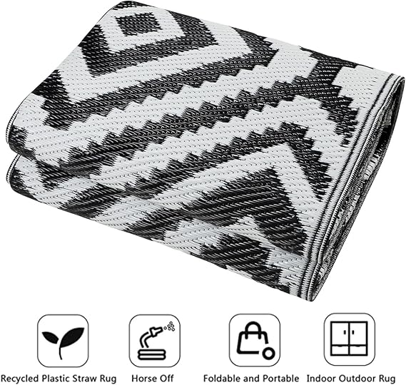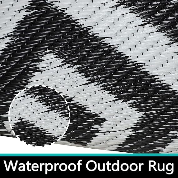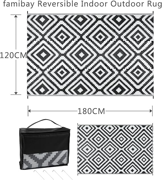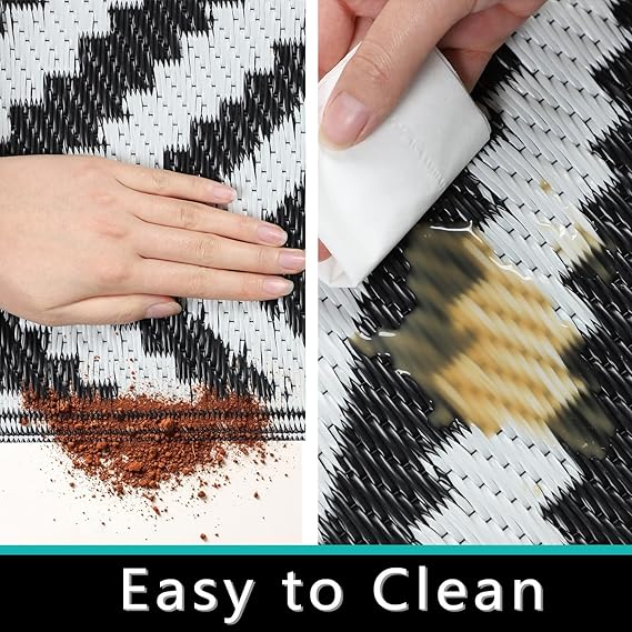 Reversible Mat: The RV camping balcony mat is reversible, giving you two stylish design options. Elegant geometric patterns on both sides will decorate your sweet home and decor, adding more fun to your trip. Easy to Clean RV Camping Mat: The patio mat is weatherproof, washable and stain-free. If there is water or coffee on the garden rug, just use a napkin or cloth to clean it. You can shake it out or rinse it with a garden hose. The balcony mat can dry in no time.